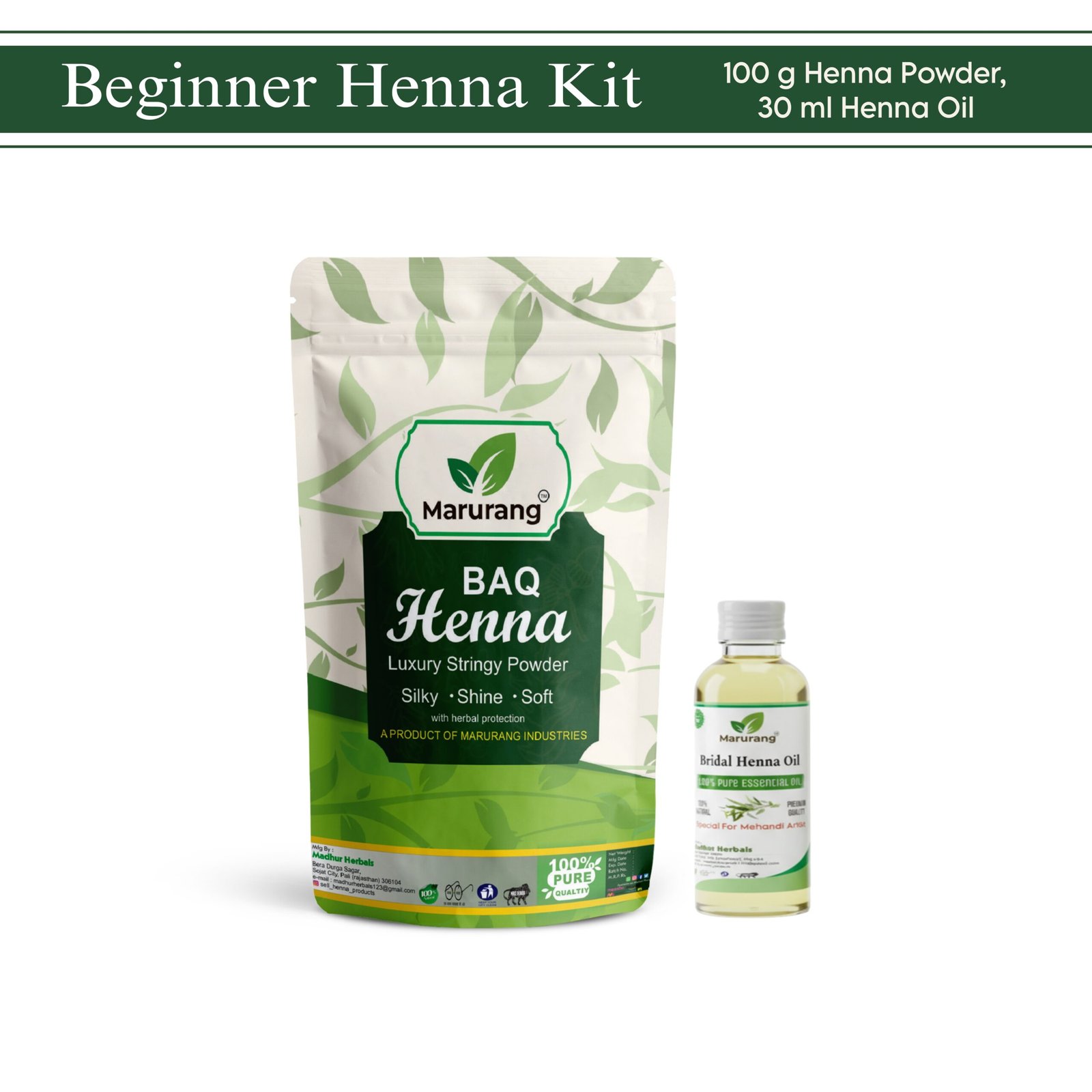 The Beginner Henna Combo Kit features 100 grams of finely ground BAQ henna powder made from the best henna leaves to ensure rich, vibrant color. The henna powder is 100% natural, free from harmful chemicals, and perfect for safe application on skin or hair. Complementing the powder is the 30ml henna oil, specifically formulated to enhance color release and deepen the stain for beautiful and lasting designs. With this kit, you can achieve professional results right from the comfort of your home.