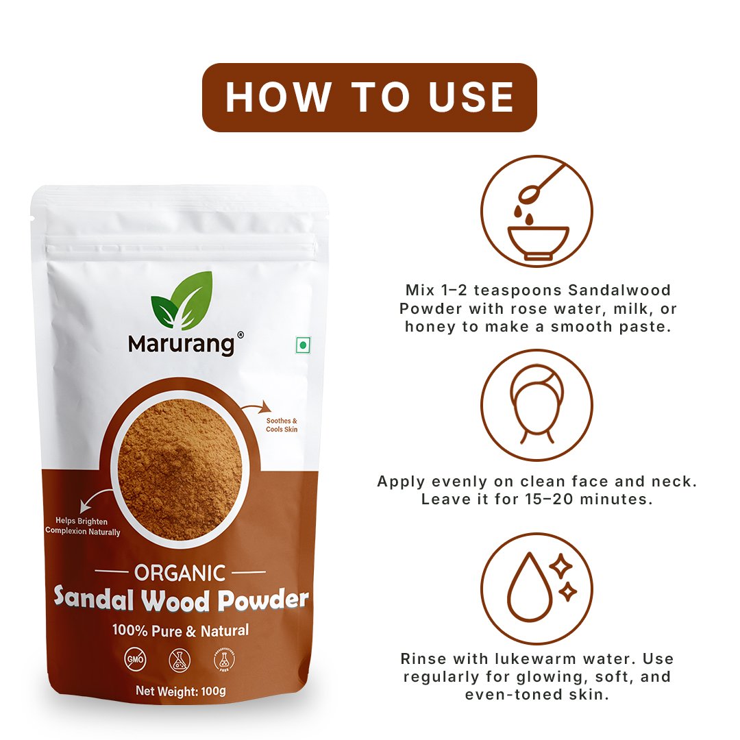 • Sandalwood Powder: Famous for its soothing and calming properties, sandalwood powder helps in reducing redness, evening out skin tone, and enhancing your skin’s natural glow.